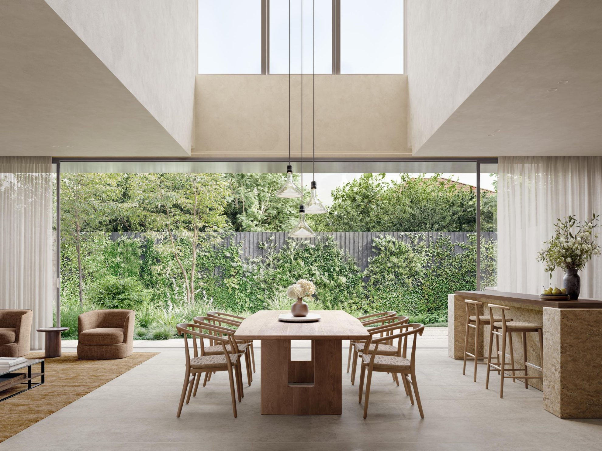 Internally, the interiors continue this quiet, residential sensibility. A warm tonal palette of natural stone, dark timber veneer joinery and stone flooring establishes a calm and refined atmosphere. Kitchens are organised with concealed functional elements and a central island bench designed for informal gathering, while concealed sculleries allow the primary spaces to remain open and uncluttered.